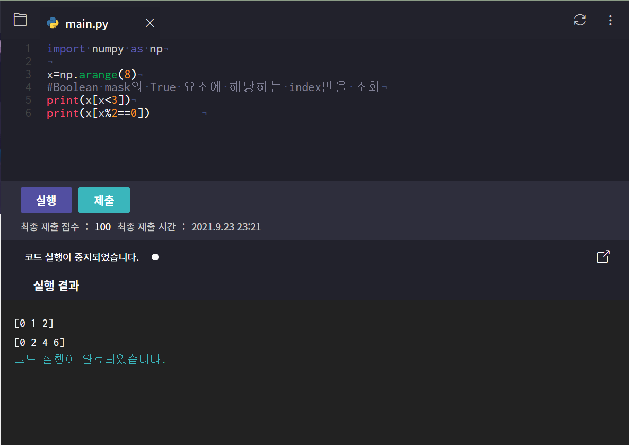 : 배열의 각 요소의 선택여부를 Boolean mask(True, False로 구성된 mask array)를 이용하여 지정하는 방식