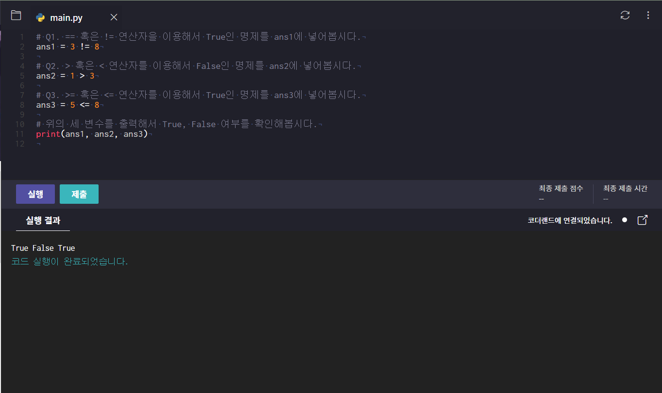 - 숫자나 문자의 값을 비교(참이면 true 거짓이면 false을 출력)