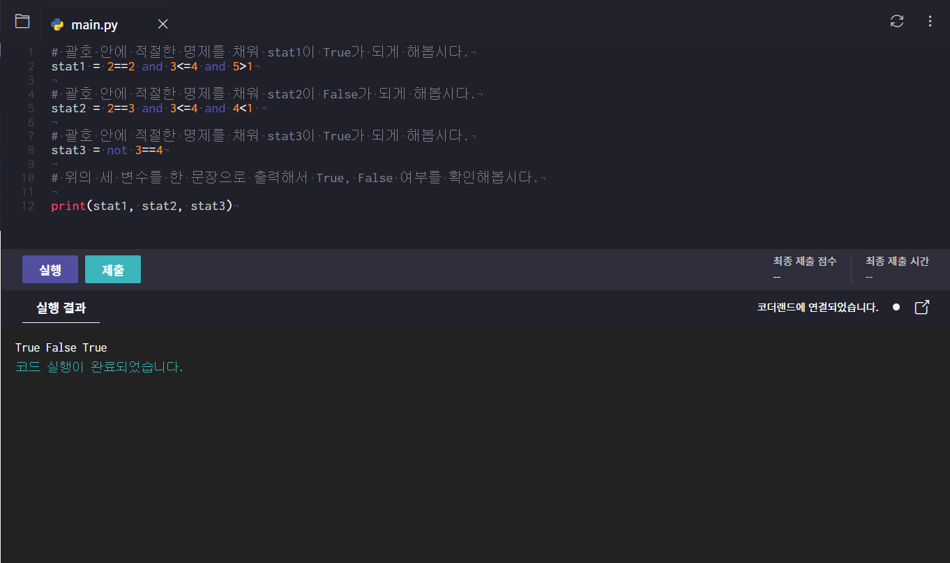 ex) print(2==2 and 3<=4 and 5>1) #세항 모두 True이므로, True출력