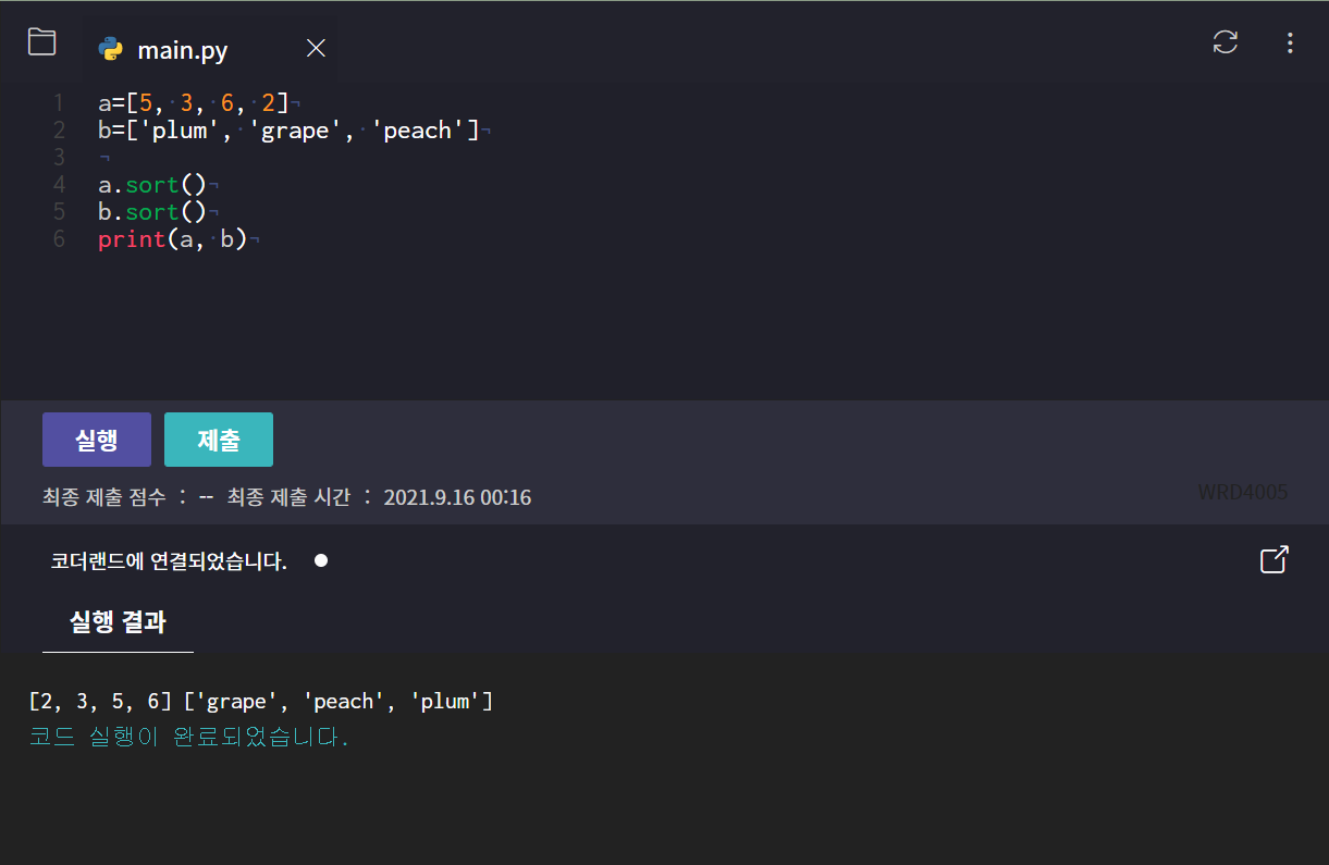 - 리스트를 정렬-> 숫자형은 오름차순, 문자열을 사전순
