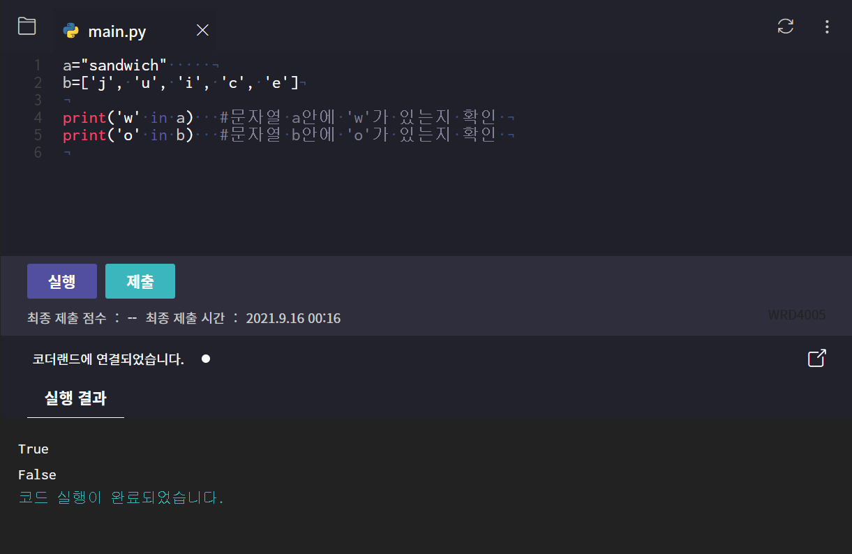 : in연산자로 시퀀스 안에 원소가 있는지 확인 가능 => True, False반환