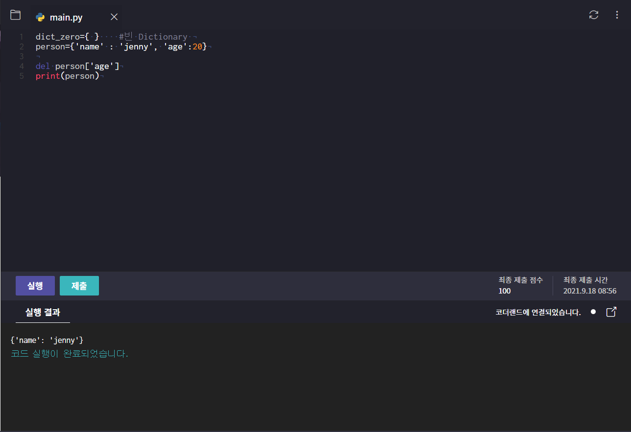 - key는 변할수 없는 자료형 - > 리스트는 안되고, 튜플은 가능